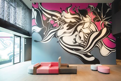 【ロビー】百合の花を波に見立てたウォールアート。