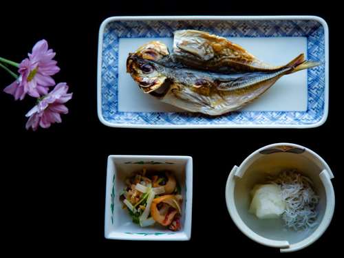 朝食(一例)焼きたてのアジの開き