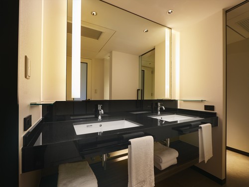 ダブルベーシンを備えたゆとりあるバスルーム