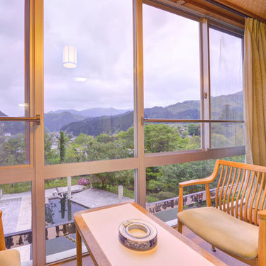 広いロビー。中庭にガーデンプールや奥津の山が望めます