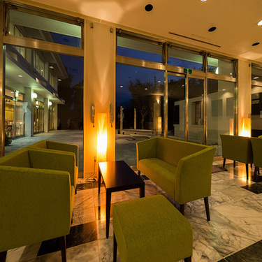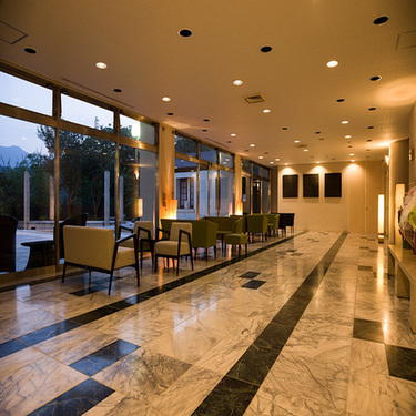 ★広いロビー。中庭にガーデンプールや奥津の山が望めます