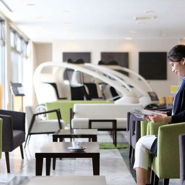 白を基調としたロビーにパステルカラーのソファは可愛い♪