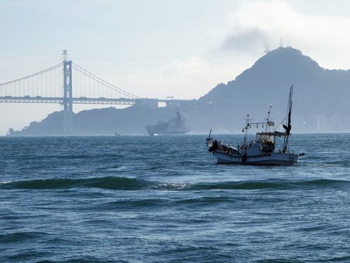 玄界灘に沈む真っ赤な夕日、沖の漁り火は感動的です。