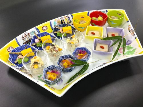 【6~8月卓袱 孔雀】彩り前菜(胡麻鯵、きびなご燻製など)