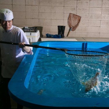1Fには巨大な生簀。社長が朝釣り上げた大物を放します