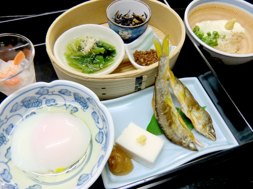 【朝食一例:和定食】自家製のお豆腐・地元のお米を使った朝粥等