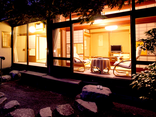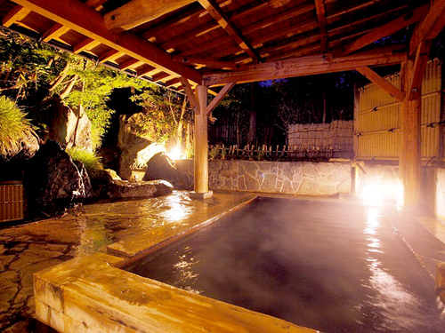 露天風呂(夜)露天風呂では庭園と滝を眺めることができます。