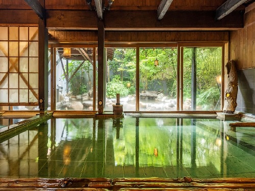 源泉かけ流しの天然温泉の大浴場。大きな湯舟でゆったりとお寛ぎいただけます!色浴衣でSNS映えも♪