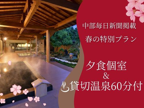 【中部毎日新聞掲載】春の特別プラン◆夕食個室×貸切温泉60分付◆源泉かけ流し湯めぐり